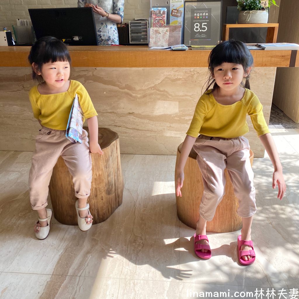 隔天準備辦理退房,在等爸爸開車過來。