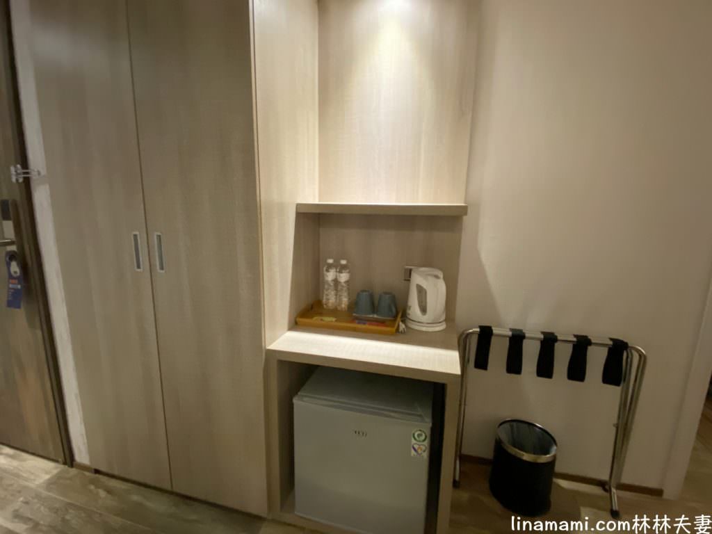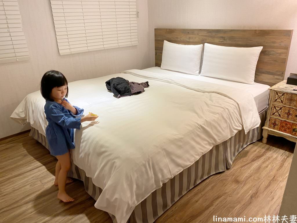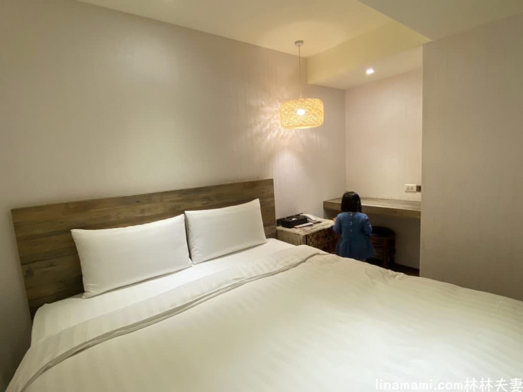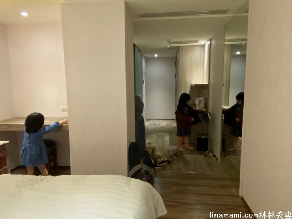 一大床的房型,空間7.2坪。一進去就是一系列原木簡約的裝潢風格,衣櫃及茶水都在一旁。