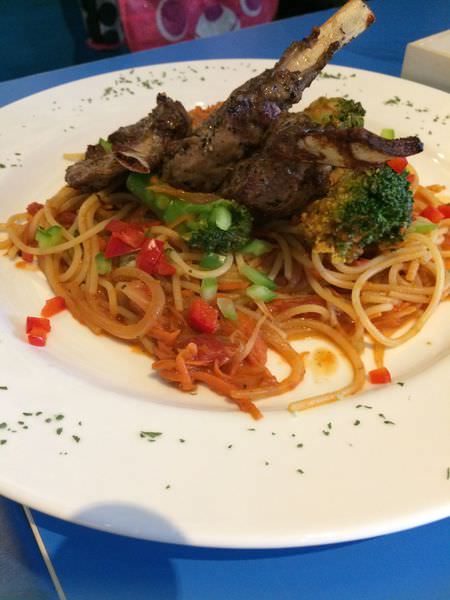 再來,招牌炭烤羊肩排佐番茄義大利麵