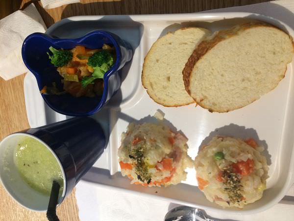 兩片麵包也偏硬,只喝新鮮奇異果汁~整個都浪費了!!!不如直接給她吃南瓜麵就好><
