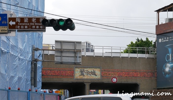 就這樣一家人傻呼呼地將車子停在陶瓷博物館旁邊的停車場(平日計次60元),卡爾爸一直說是佛心價啊!!!沿路一直碎念停到賺到。結果跟著估狗地圖想走去老街!沒想到整個不知道是走偏還是走歪了,超級不近啊!!!繞來繞去,加上路邊的人行道超小,大卡車也進進出出,真的一度想要放棄!!!好不容易走到了鶯歌城,看到陶瓷老街的招牌了,還標示第二停車場!!!這個轉角還在施工,非常難走。依這次的經驗,如果是平日想去老街,真心推薦直接開到老街找停車場就好,不建議帶兩隻小的從陶瓷博物館走過去,真的是大挑戰!!!(可能有條捷徑我們外地人不知道XD)