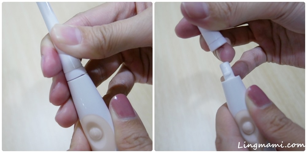 更換方式也很簡單,將刷頭向右轉,往上拉起;接著將新的刷頭插入本機,然後往左轉即可完成組裝。組裝完畢就準備來刷牙摟!