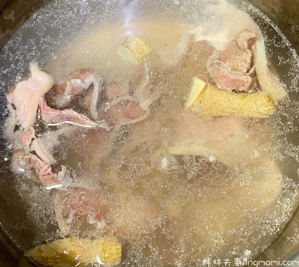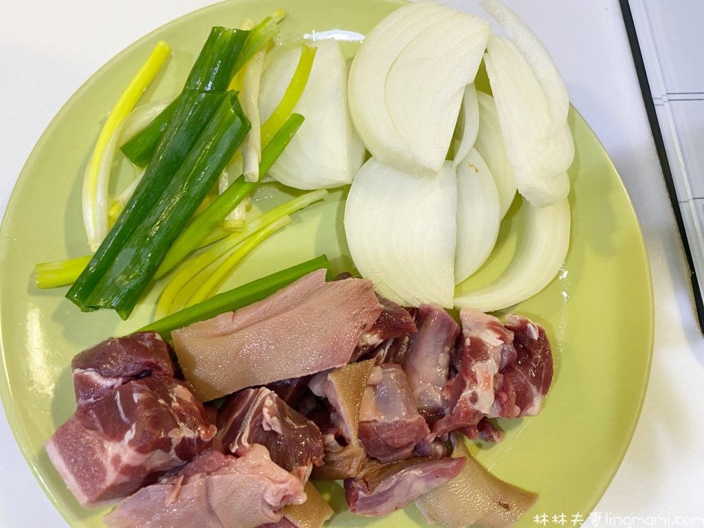1.將羊頸肉片、薑片一起川燙