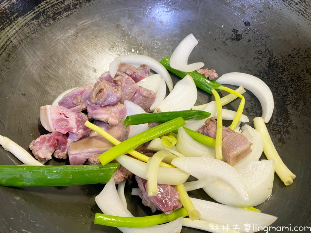 1.將羊頸肉塊、青蔥、洋蔥先拌炒