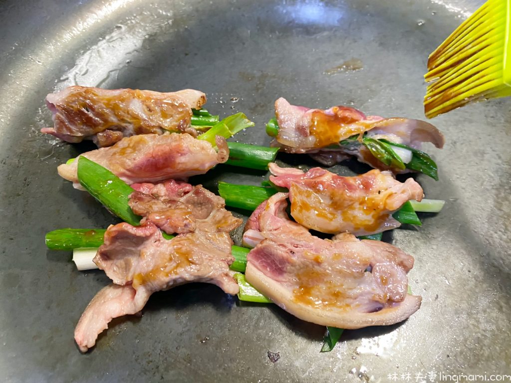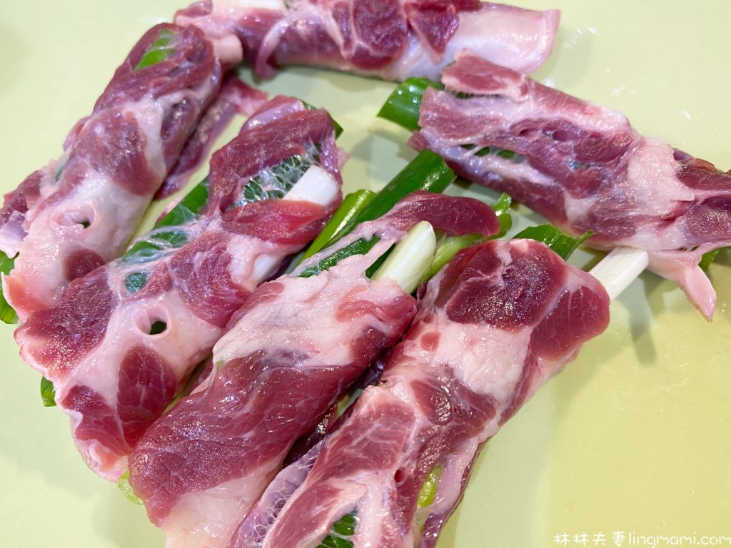 2.將青蔥切斷,肉片裹著青蔥,像烤肉串一樣