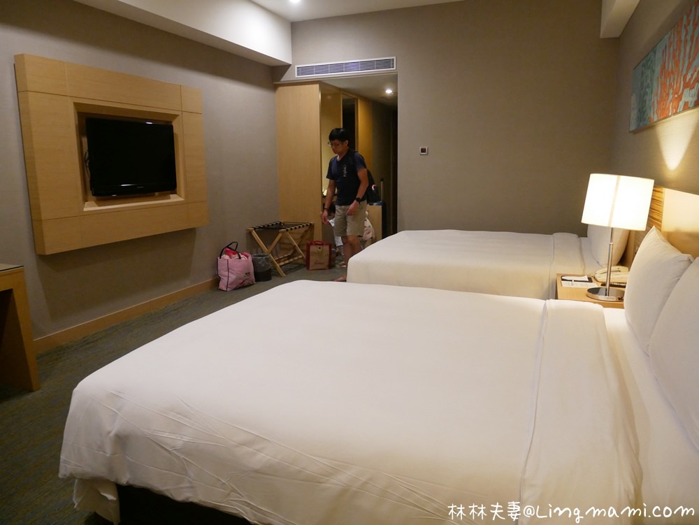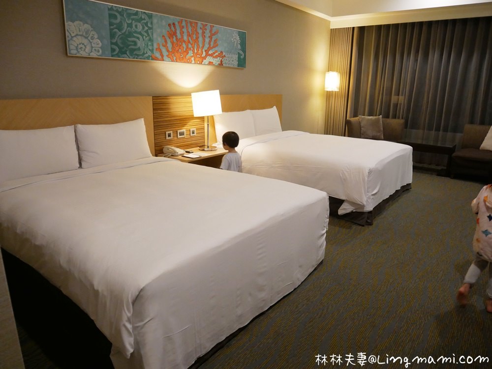 我們這次是入住豪華家庭房,使用之前購買的平日住宿票卷,一進門就看到兩張大床(大約160*200cm),房間也很寬敞又乾淨。小妞一進門就直奔電話….