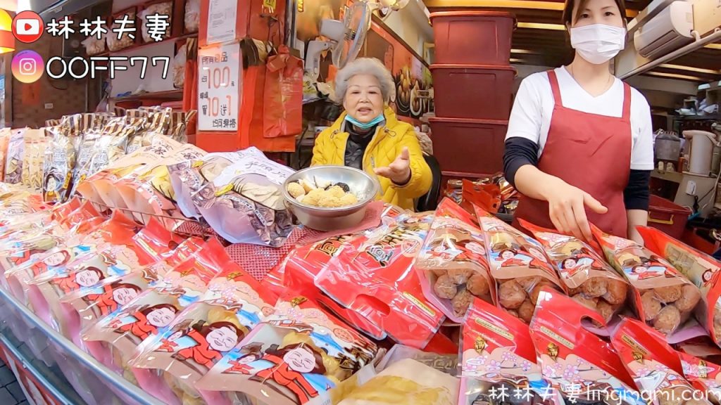 老街裡也有喔~剛好碰上老闆娘阿玉耶!一包只要一百元,現場還可以試吃喔~我們馬上帶走了一包綜合的!我個人偏愛花生的~