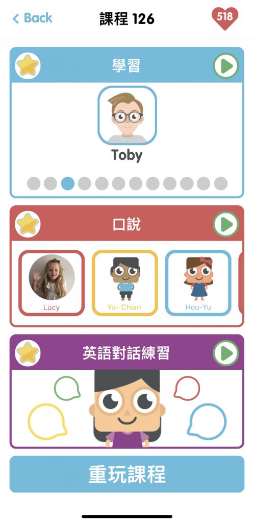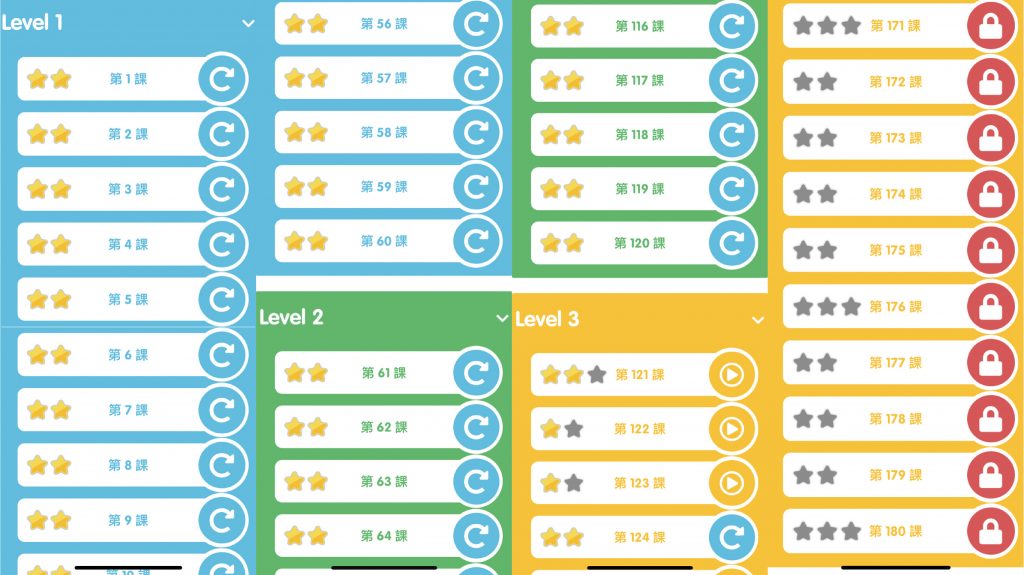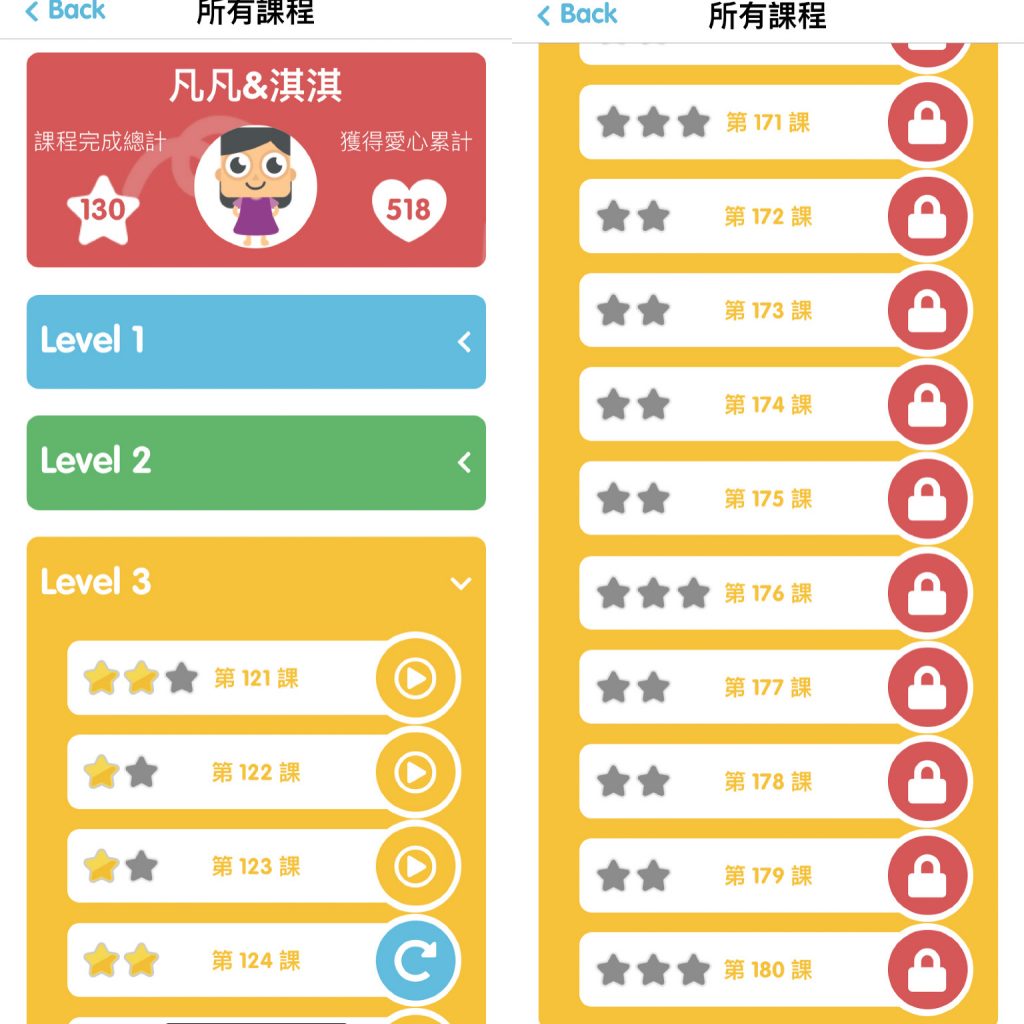 A6:目前只開放這三個Level的課程,不過即使每天都上課,也需要180天才上的完,其實是蠻夠用的,而且全部上完之後,系統每天仍然會有不一樣的隨機複習課程,或者也可以自己選擇想要重新複習的課程內容,不論是整堂課或是一個小單元都可以任意選擇,讓孩子的學習不中斷,持續進步,愈來愈熟練喔!(但我個人其實是蠻期待未來是不是會有Level 4的誕生呢?哈囉~Lingumi你聽到我的心聲了嗎XD)