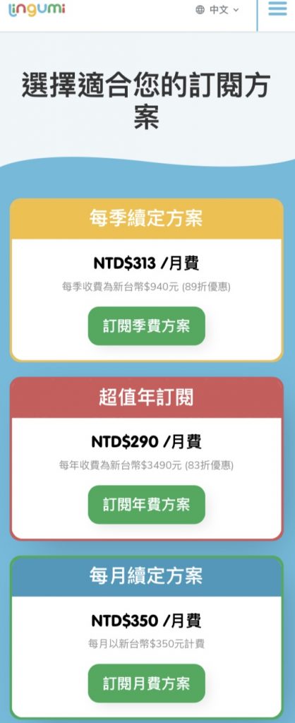 A15:沒問題!可以聯絡或直接寫信給Lingumi的客服 support@lingumi.com ,請他們協助使用「林林夫妻」的專屬折扣碼【00ff77】更改成我們優惠的年訂閱喔!