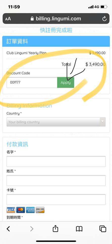 A16:這項優惠就是適用在這個APP沒錯喔!但折扣碼限定新會員而且是年訂閱才可以使用,如果是剛訂閱沒跟上優惠的朋友,則需要聯絡客服,協助使用折扣碼;另外需要從網頁版的結帳頁面訂閱才能輸入折扣碼喔!(折扣碼在下圖處輸入喔!)