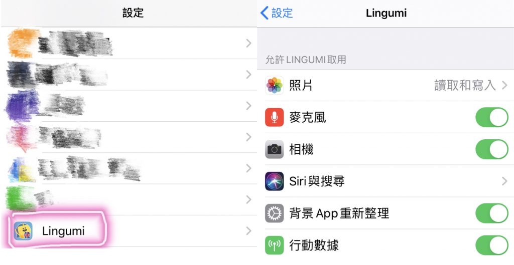 A22:可能是手機設定的地方並沒有開放「攝影和麥克風的使用權限」喔!在手機設定裡點進Lingumi,把麥克風和相機的使用權限打開應該就行了!或者也可以聯絡客服或直接寫信給Lingumi的客服 support@lingumi.com ,請他們協助處理喔!