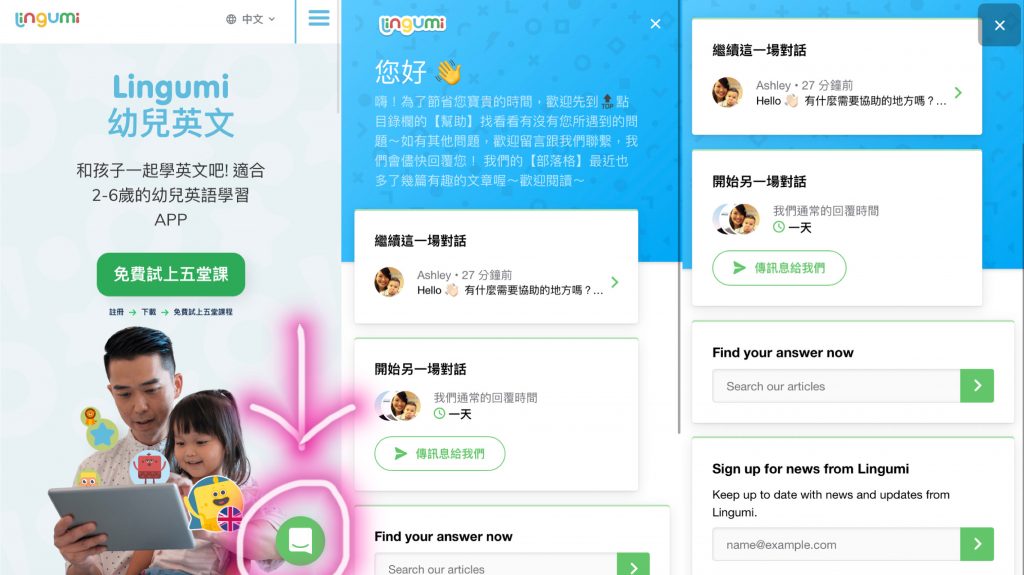 (3)點進官網 https://lingumi.com/tw/contact 右下方的「綠色對話框鍵」,傳訊息聯繫客服。