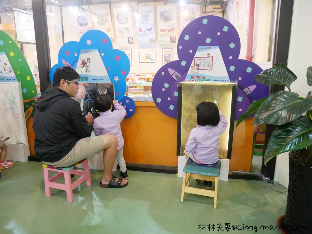 靠近教室的一旁有一列的鏡面板,可以讓小朋友自由創作,剛好拿來打發等待的時間,兩姊妹也是畫得不亦樂乎。