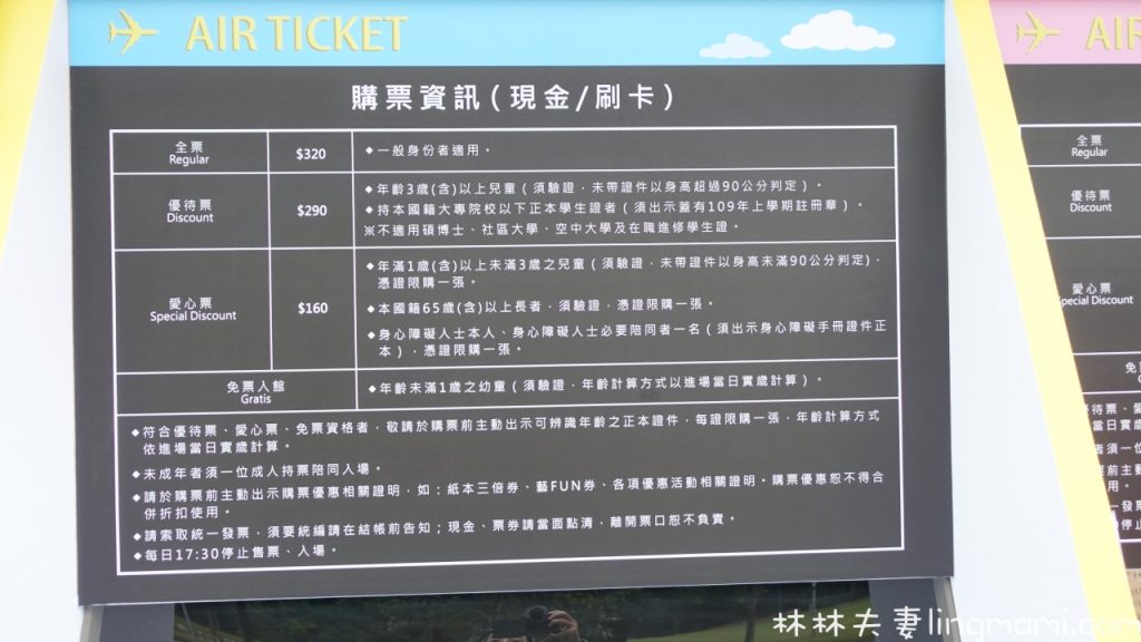 購票採現金或是刷卡,三歲以上就需買票,優待票290元,成人一般身份則是320元,未滿一歲幼童免費入場。