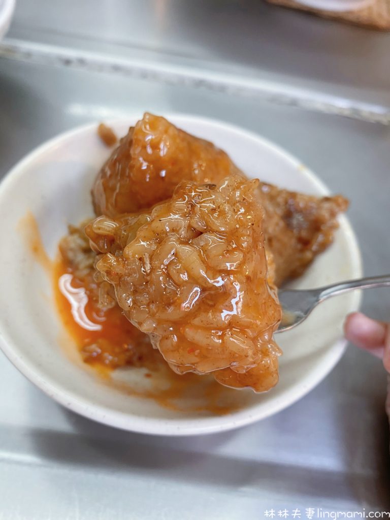 肉粽大小份量對女生來說剛剛好,吃下一口之後,粽葉的香氣及米香,整個在嘴裡漫開。超建議一定要加甜辣醬整個對味啊!口感又加分許多~