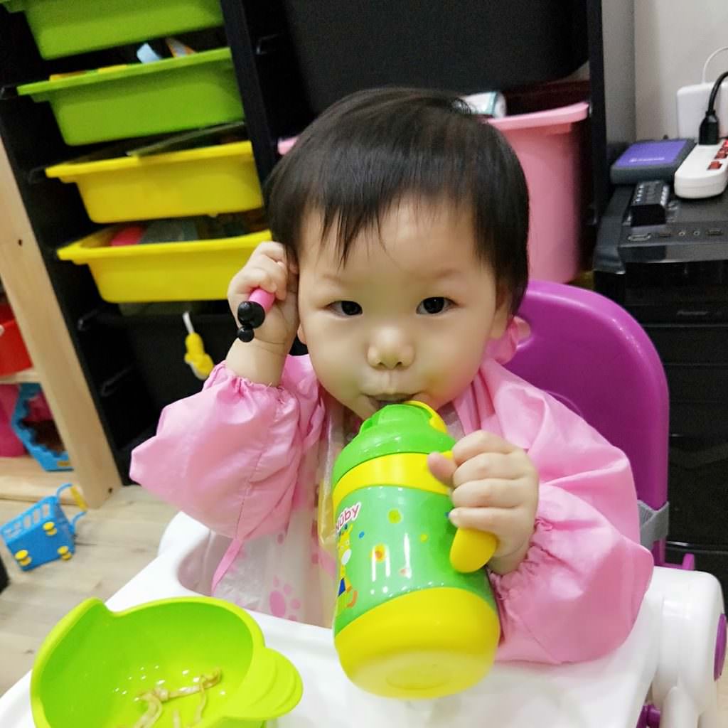 當然,一開始不會馬上學會用吸管喝水,那也不用急,可以先用湯匙一口一口餵她喝點水,大約20~30cc,先讓她習慣喝水這件事。但是,每天還是會幫她裝好水杯,放在她容易拿到的地方,可能是床邊或是餐桌上。吃完飯一定會直接拿給她,讓她練習。再者就是爸媽或姐姐會示範喝水給她看,久了她就會模仿學習,慢慢讓她嘗試就會抓到技巧,很快就會用吸管杯喝水。當她吸上第一口時,真的會很有成就感,寶寶也會很開心,漸漸就會主動自己拿水來喝。記得,一定要給寶寶有學習的機會,水杯都沒拿給他幾次,就想要他會喝,真的太難了。每個小孩學習力不同,像是凡凡六個月就學會、淇淇則到八個月才會;慶幸的是兩姊妹都算是愛喝水的,每天都會主動自己拿水喝,姐姐還會急著拿水杯給妹妹,不太需要我提醒。