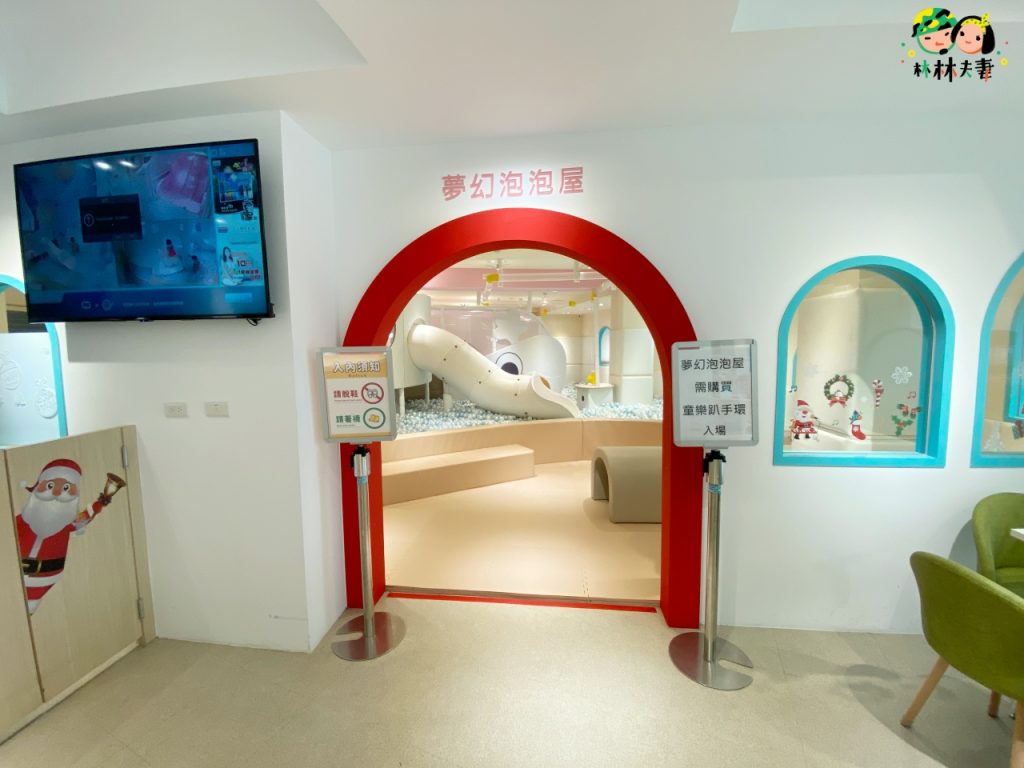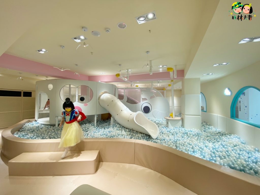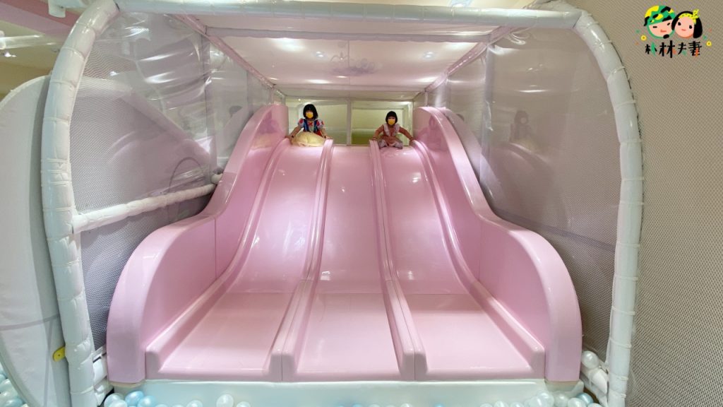 粉紅色的滑梯道也太夢幻了吧!還有超美的藍白色珍珠球池~~~