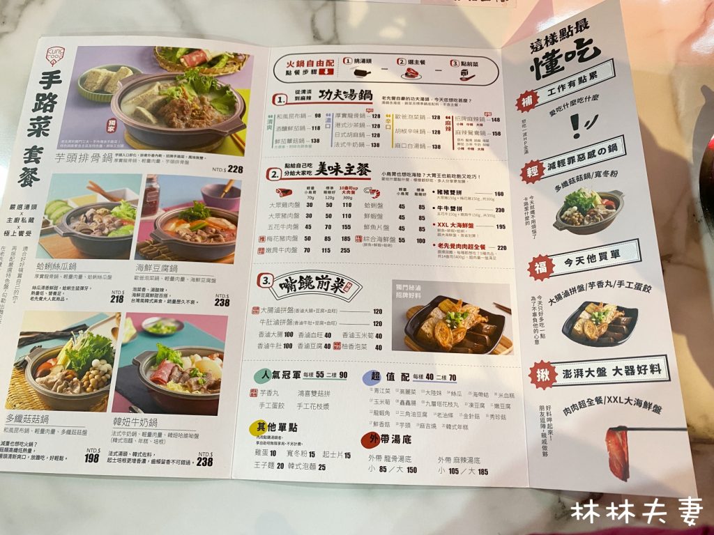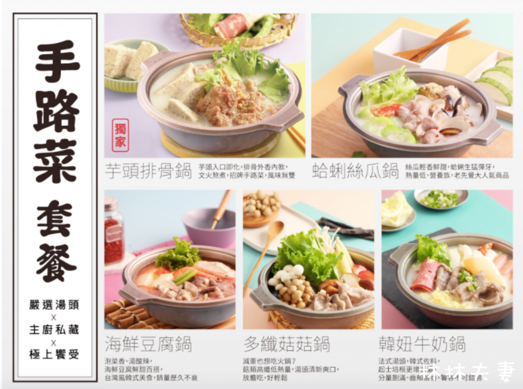 推出手路菜套餐,獨家的芋頭排骨鍋、蛤蠣絲瓜鍋、海鮮豆腐鍋、多纖菇菇鍋、韓妞牛奶鍋,五種套餐選擇,如果有選擇障礙的朋友,可以直接點選套餐,還有輕量級的肉盤。