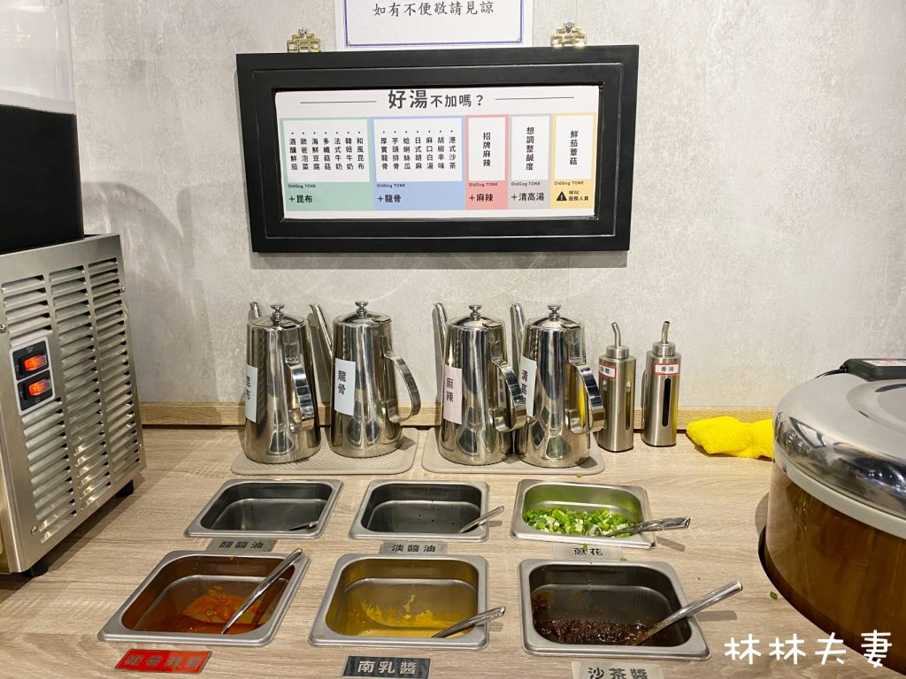 高湯也可以自己加,直接取用就可以,這裡都有告訴你如何選擇。醬料比較簡單,只有八種選擇(沙茶、南乳將、麻辣醬、醬油、青蔥、醋等),如果喜歡吃辣推薦辣醬很特別。