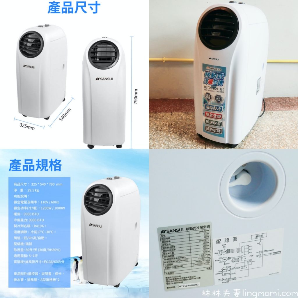 這台山水移動式空調SWA-9900的尺寸,寬、深、高為325 * 540 * 790 mm,淨重29.5公斤,並不算小,但有滾輪,移動起來很順,而且使用的是一般家用電壓110V/60Hz,隨處可用,挺方便的!