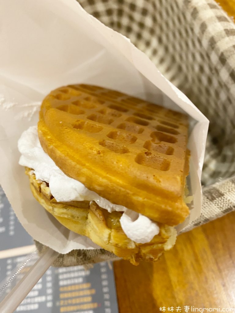 雙折的半圓型格子鬆餅,裡面擠滿了滿滿的鮮奶油跟蜂蜜~~~