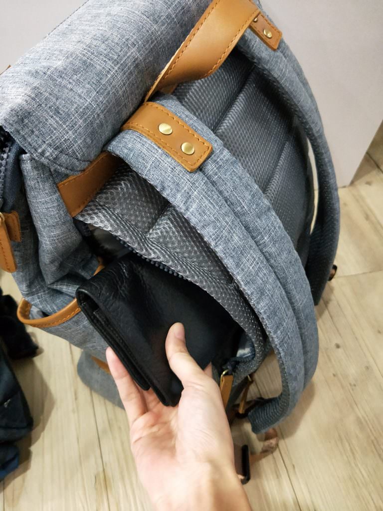 後背一樣做有側邊拉鍊暗袋,最大可以收納到11吋的平板。