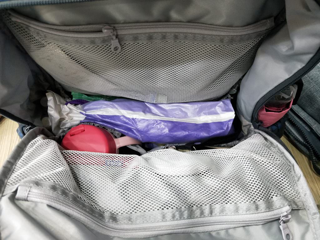 前層是專放寶寶用品的,就有8個隔層可以放大大小小東西。下面有6個做彈性伸縮束口設計,可以放水杯之類的,不用擔心會東倒西歪,上層做兩個網狀拉鍊收納,我超愛這兩個空間,可以放超多小東西,而且馬上就看得到,不用翻半天找不到。