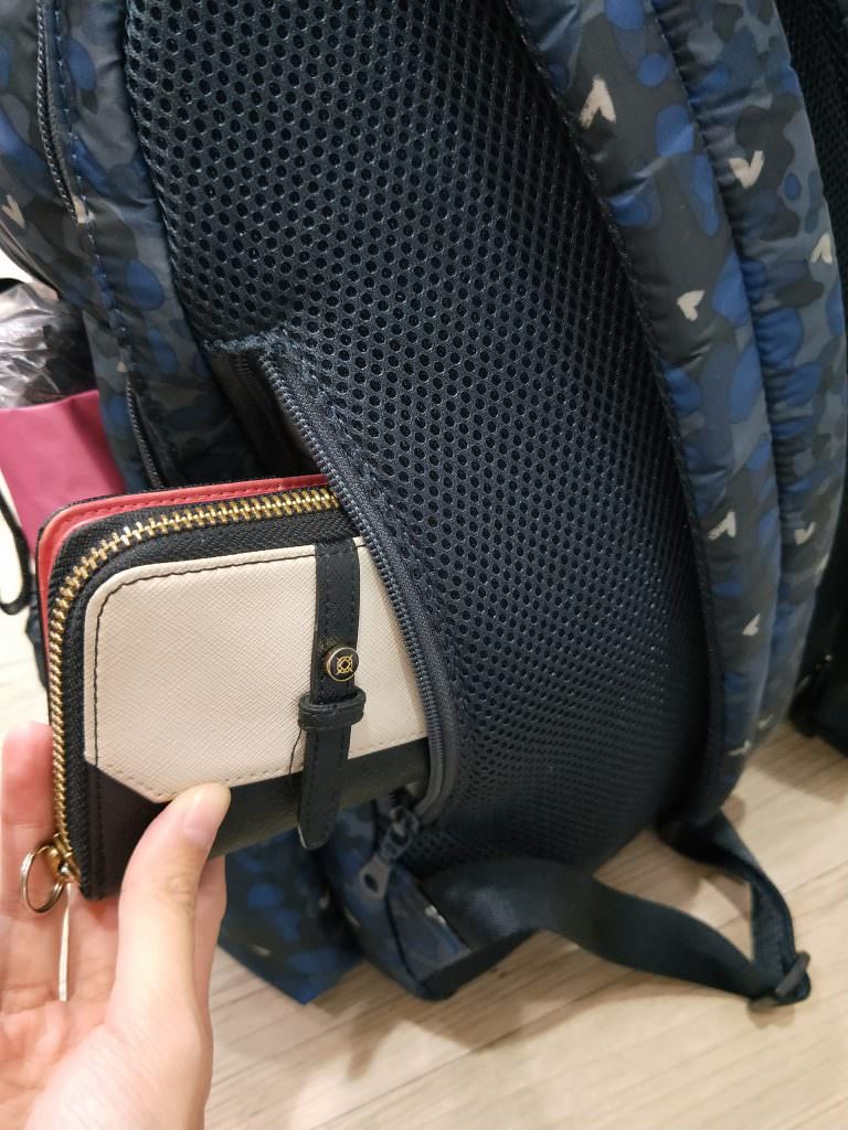 背部還有一個側邊拉鍊暗袋,可以收納我們的皮夾,以前暗袋設計我都覺得中看不中用,因為都很小,頂多放個手機就沒了。但是這款的暗袋是連我的長皮夾都可以塞進去,買東西也終於不用在手忙腳亂了。