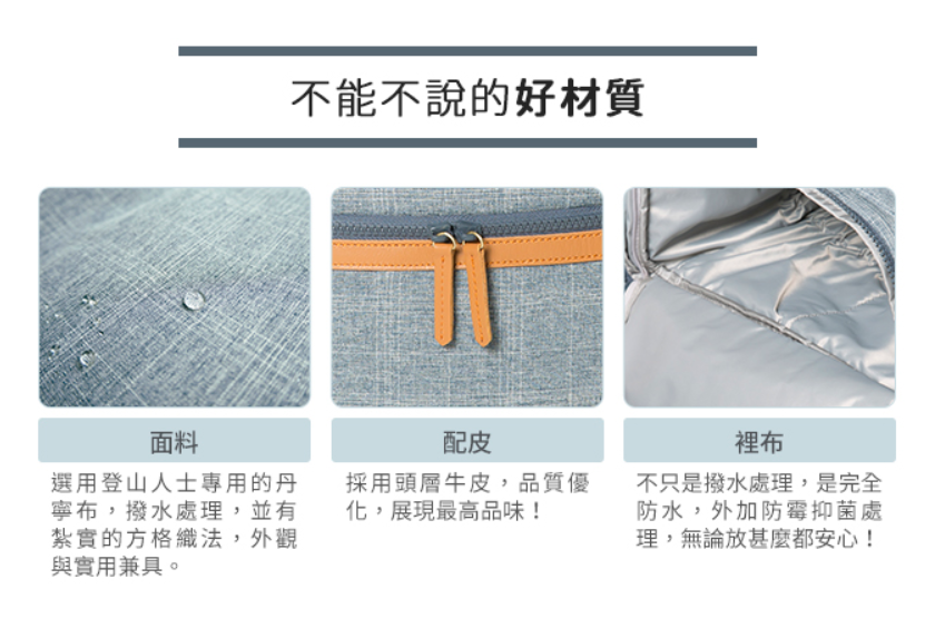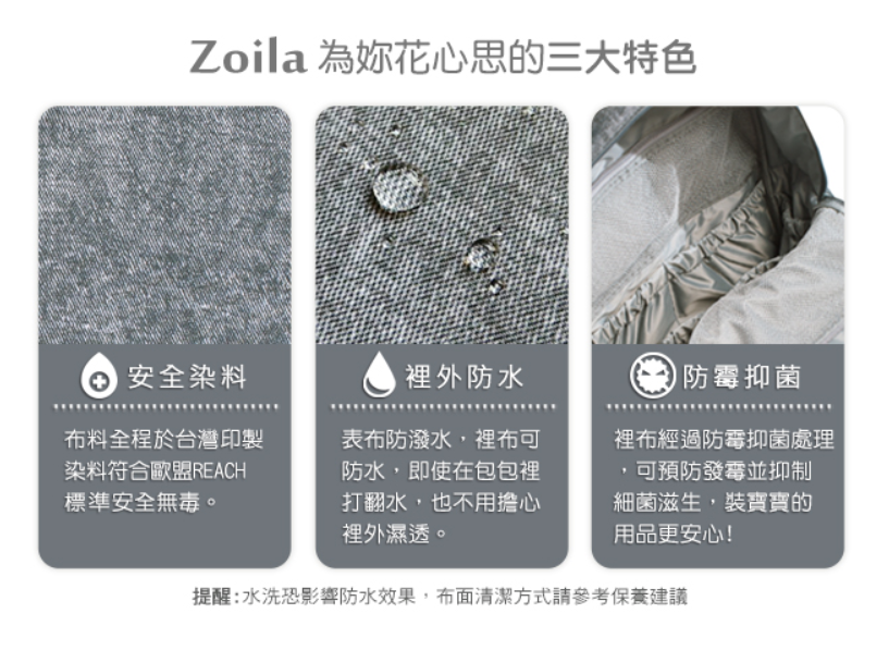 除此之外,zoila整體還有三大特色也很重要,使用安全染料、裡外都防水、防霉抑菌。